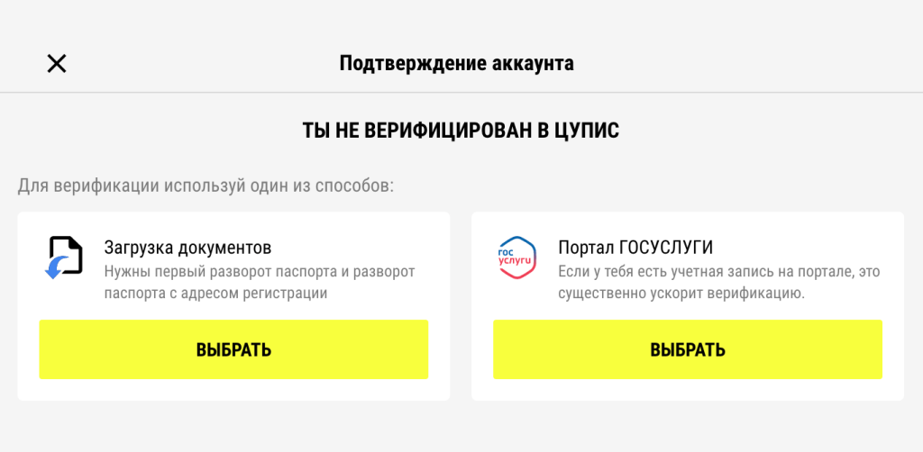 A verificação simplificada pode ser realizada de duas maneiras: enviando seus documentos diretamente para o site ou fornecendo acesso à sua conta nos Serviços do Estado. Esta verificação será suficiente para fazer apostas.
